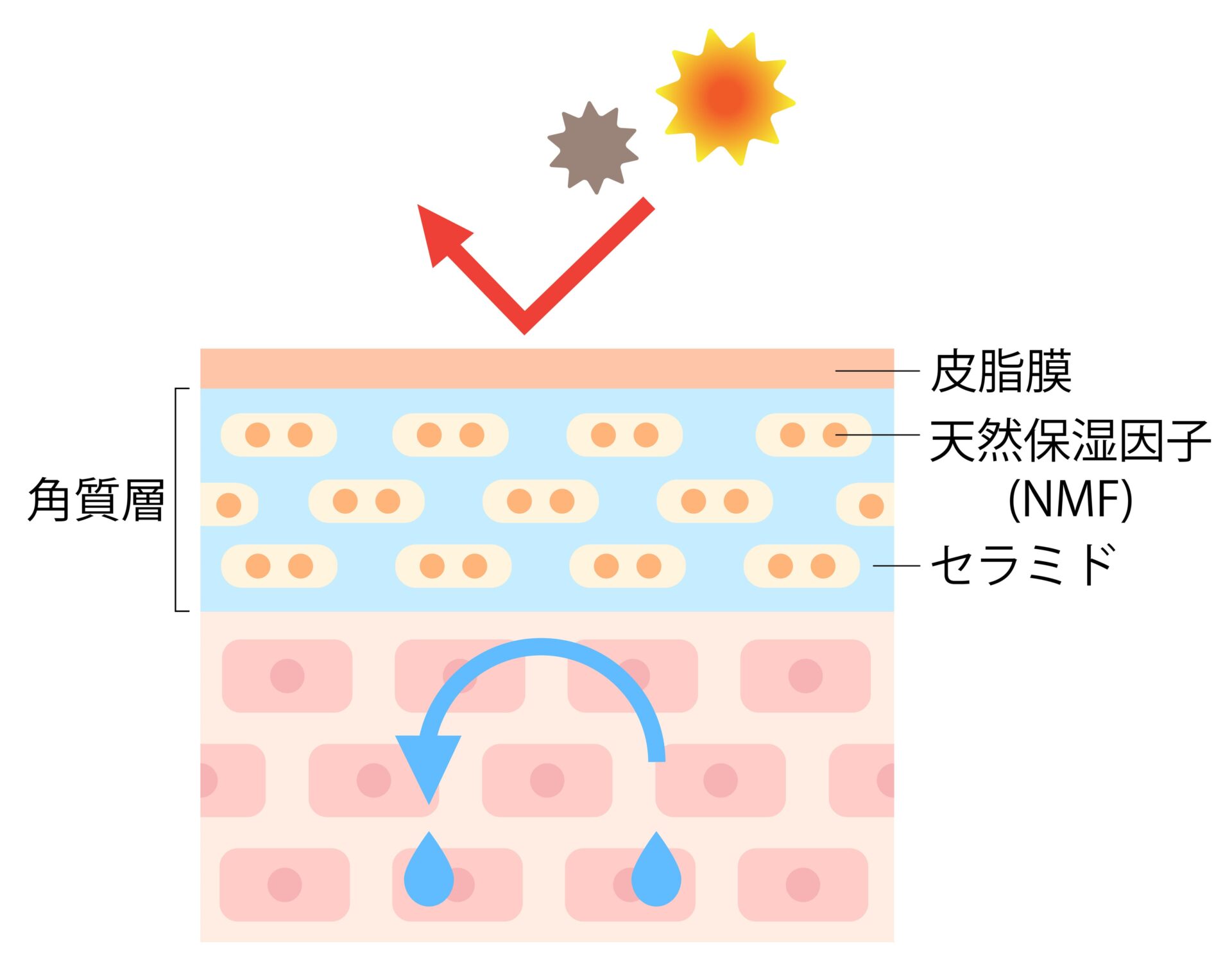角質層の皮脂膜・天然保湿因子・細胞間脂質により、紫外線・アレルギー物質・ウイルスなどの外的刺激からお肌を守ったり、体内の水分が蒸発してしまうのを防ぐことを「バリア機能」と呼びます。