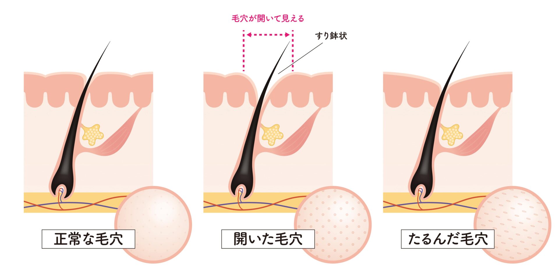 毛穴の開きは、皮脂分泌・乾燥・加齢などさまざまな要因によって引き起こされます。