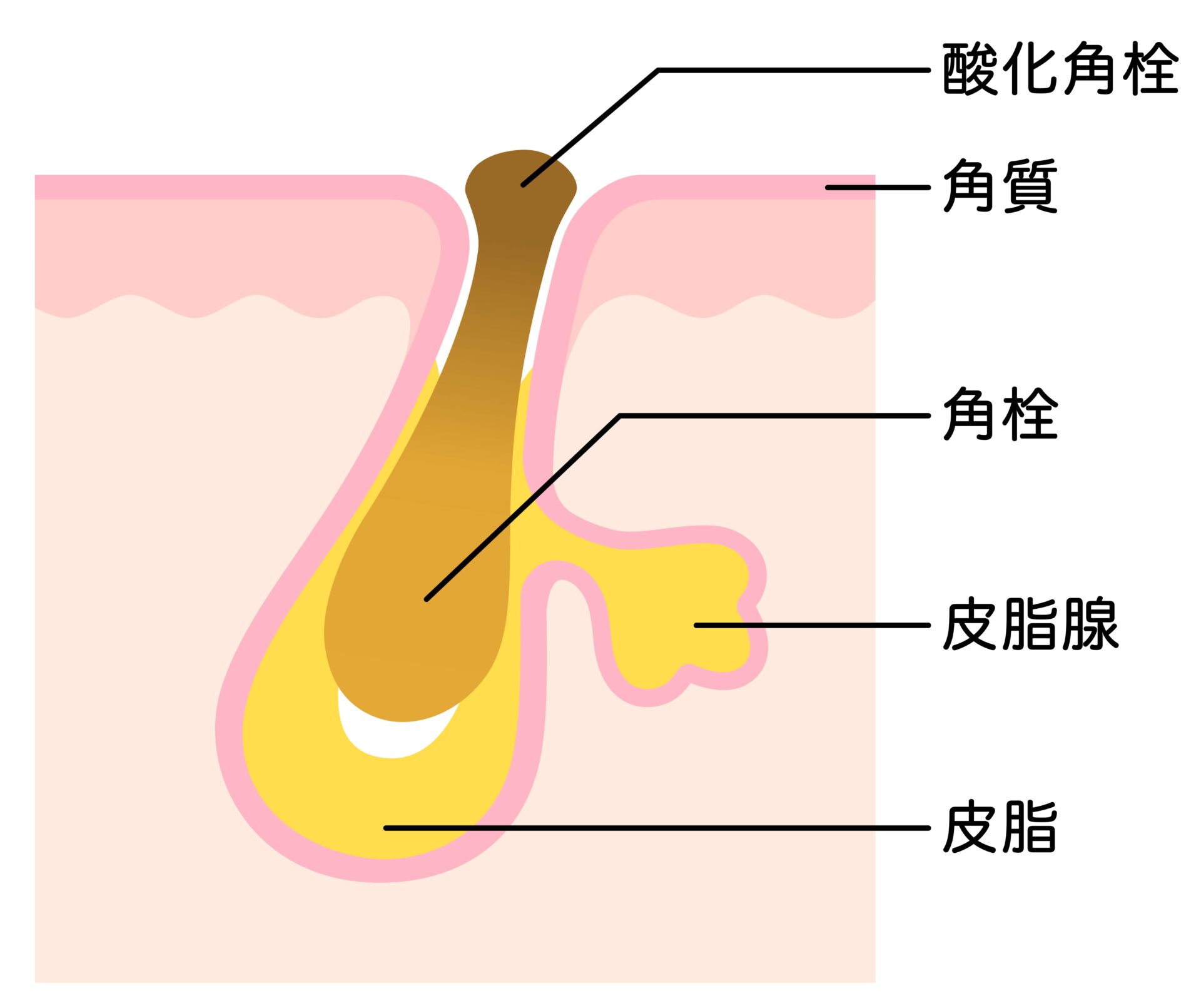 一般的には28日が理想的なターンオーバーですが、何らかの原因でターンオーバーのサイクルが長くなってしまうと、古くなった角質が排出されずお肌に残ります。この残った古い角質に皮脂が付着し、角栓となり、毛穴をふさいでしまうのです。